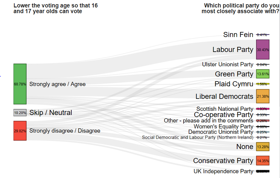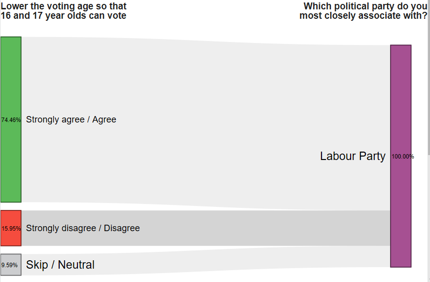 Then, if we compare the results of the question about lowering the voting age with how people answered to “What political party do you most closely associate with”, this is what we see: