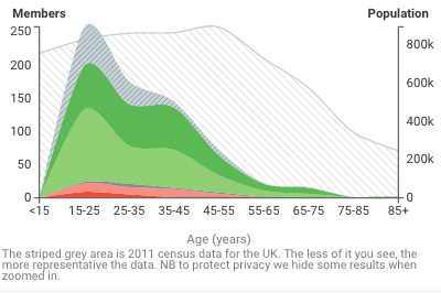 You cast a total of 4,583 votes and made 36 comments. Comments came from across the UK with a representation mostly of people between the ages of 15 and 55, as the map and graph for the most voted on question, ‘New building developments should include allotments’ shows.